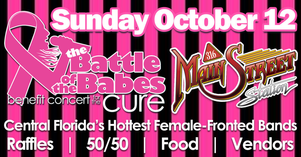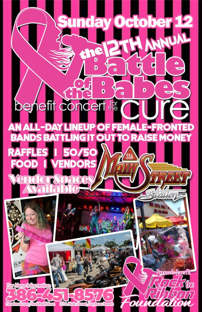 The 12th Annual Battle of the Babes for the Cure returns to Daytona Beach on Sunday, October 12, 2025. This all-day benefit concert at Main Street Station features some of Central Florida’s hottest female-fronted bands, each competing to raise the most money for breast cancer awareness and support.