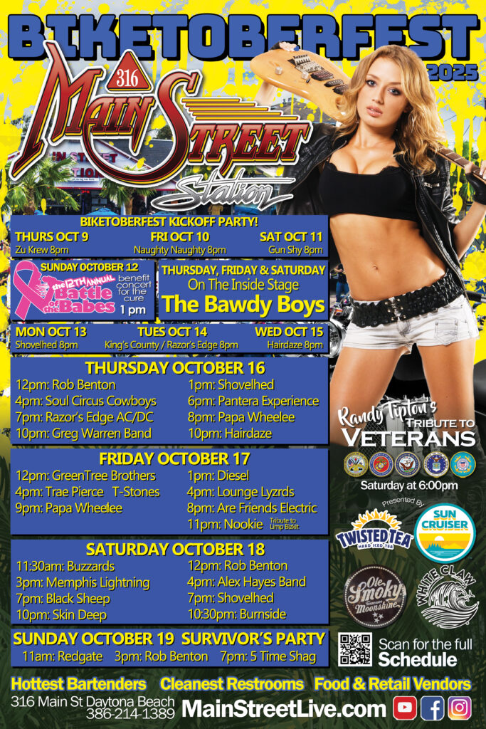 The wait is over… BIKETOBERFEST 2025 is back at Main Street Station! From Thursday, October 9th through Sunday, October 19th, we’re bringing live music, motorcycles, drinks, and non-stop fun to Daytona Beach.