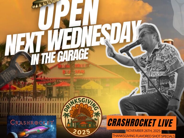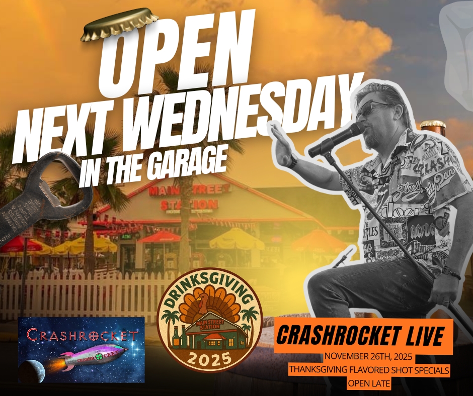 Drinksgiving Night returns to Main Street Station featuring Crashrocket live on stage. It’s Daytona’s biggest pre-holiday party — come early, grab your drink, and enjoy a night full of rock. Admission free, limited parking, 21+ only. More details at www.mainstreetlive.com. Life’s Better in the Garage.