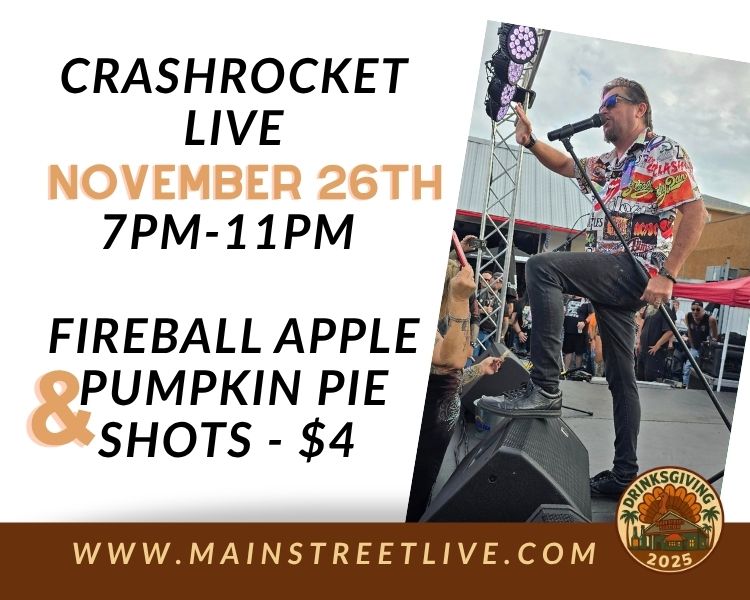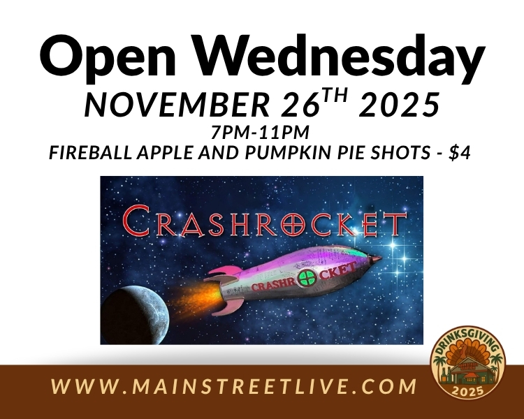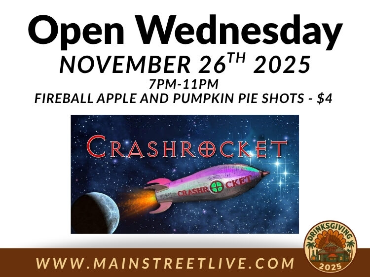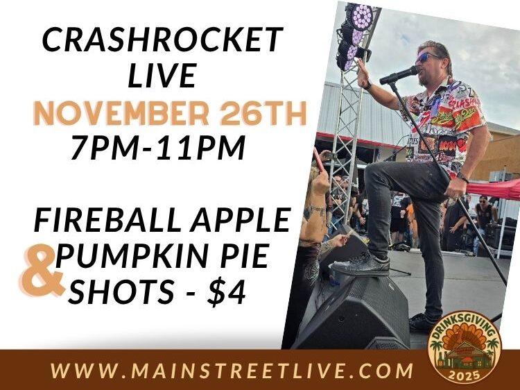 Short Summary: Kick off Thanksgiving weekend with Crashrocket live for Drinksgiving Night at Main Street Station.